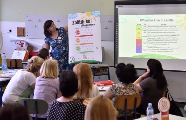 Učitelji iz 27 odeljenja od prvog do četvrtog razreda OŠ „Dušan Radović“, tokom edukacije, mogli su da čuju da je, u periodu između 10 i 17 časova, kada je UV zračenje najviše, neophodno da se deca sklone sa sunca, jer osetljiva dečja koža može da izgori i za pet minuta. Istaknuto je i da, u periodima dana kada je UV indeks malo niži, boravak napolju takođe nije