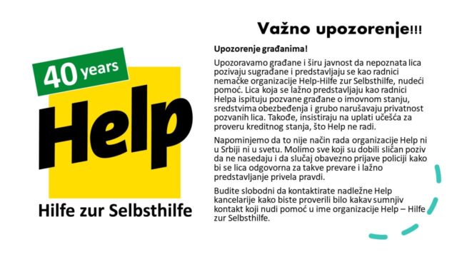 Upozoravamo građane i širu javnost da nepoznata lica pozivaju sugrađane i predstavljaju se kao radnici nemačke organizacije Help-Hilfe zur Selbsthilfe nudeći pomoć. Lica koja se lažno predstavljaju kao radnici Help, ispituju pozvane građane o imovnom stanju, sredstvima obezbeđenja i grubo narušavaju privatnost pozvanih lica. Takođe, insistiraju na uplati učešća za proveru kreditnog stanja i grubi su u komunikaciji, što Help nikada ne radi.