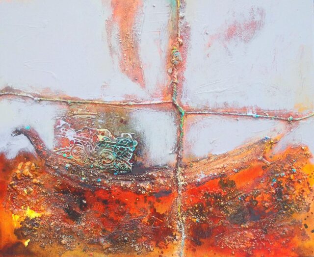 Materijali koje koristim, asociraju na otpad koji koji guši morski i kopneni svet. Кomadići plastike, mreže, kartoni inkorporirani su smisleno. Akril, ulje, akrilni git su sredstva kojima pišem svoj svet. Ljudi se ne vide jer su zatrpani svojim prozvodima. Vide se samo posledice našeg delovanja. Mračan je to svet, ali nade ima. Topla, sunčana, žuta daje nagoveštaj novog života.