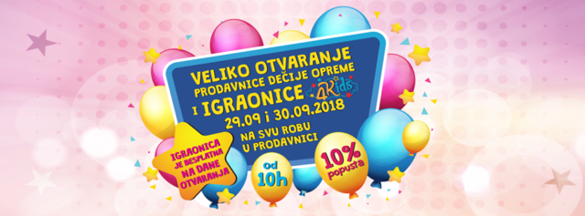Ne propustite veliko otvaranje prodavnice dečije opreme i najveće dečije igraonice 4KIDS. Na dan otvaranja 29.09 i 30.09 na kupovinu bilo koje robe iz našeg asortimana ostvarujete 10%, a za mališane igranje u našoj igraonici na dan otvaranja je potpuno besplatno. 4KIDS se nalazi na Matejevačkom putu na kraju Somborskog Bulevara.