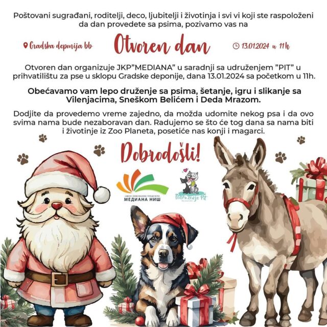 U subotu 13. januara Udruženje za zaštitu životinja „Pit“ i JKP „Mediana“ organizovaće Otvoreni dan za posete u prihvatilištu za pse u okviru Gradske deponije, od 11 sati. Ljubitelji životinja, imaće priliku da provedu vreme sa psima iz prihvatilišta, ali i sa konjima i magarcima.