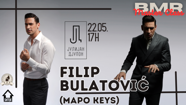Drugu muzičku radionicu u okviru ovogodišnjeg ciklusa “BMR MasterClass”- a u organizaciji Štek House-a održaće pijanista, kompozitor i dirigent Filip Bulatović (Mapo Keys) u kući Julijana Djupona 22. maja sa početkom od 17 časova. Ulaz je besplatan i nije potrebna prijava.