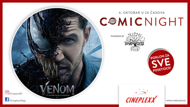 Jedan od najsloženijih Marvelovih likova, novinar Edi Brok postaje domaćin vanzemaljskog stvorenja zvanog Venom. Da li je Venom najneobičniji junak ili antijunak saznajte na Comic night događaju u bioskopu Cineplexx Niš u Stop Shop ritejl parku, u četvrtak 4. oktobra od 20 časova! Karte su u prodaji na blagajni bioskopa.