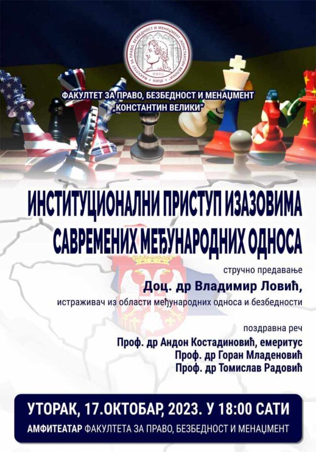 Na Fakultetu za pravo, bezbednost i menadžment „Konstantin Veliki“ danas u 18 časova doc. dr Vladimir Lović će održati stručno predavanje pod nazivom „Institucionalni pristup izazovima savremenih međunarodnih odnosa“.