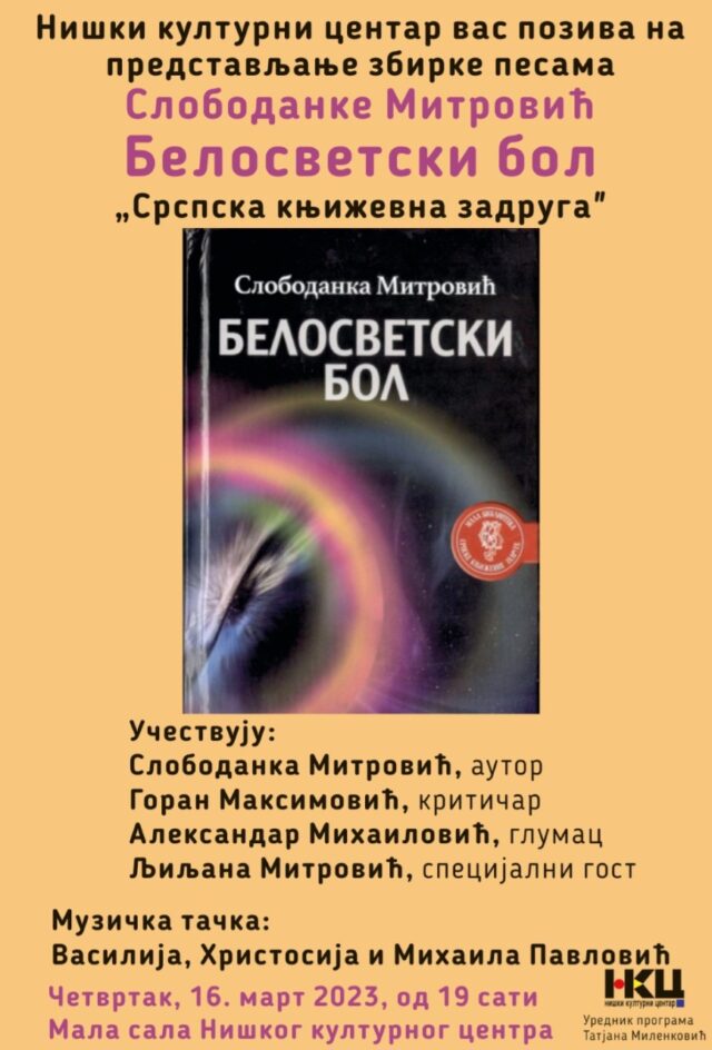 Zbirka pesama autorke Slobodanke Mitrović, nastala u doba pandemije Korona virusom, koja svojim naslovom „Belosvetski bol“ daje pečat tom vremenu, biće predstavljena u Maloj sali Niškog kulturnog centra, u četvrtak 16. marta 2023. godine, sa početkom u 19 sati.