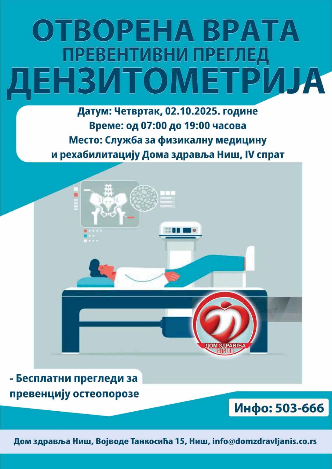 Dom zdravlja Niš u četvrtak, 2. oktobra, organizuje akciju „Otvorena vrata za denzitometriju”. Građani će u periodu od 7 do 19 časova, bez zakazivanja i bez uputa, moći da obave pregled određivanja mineralne gustine kostiju u Službi za fizikalnu medicinu i rehabilitaciju.