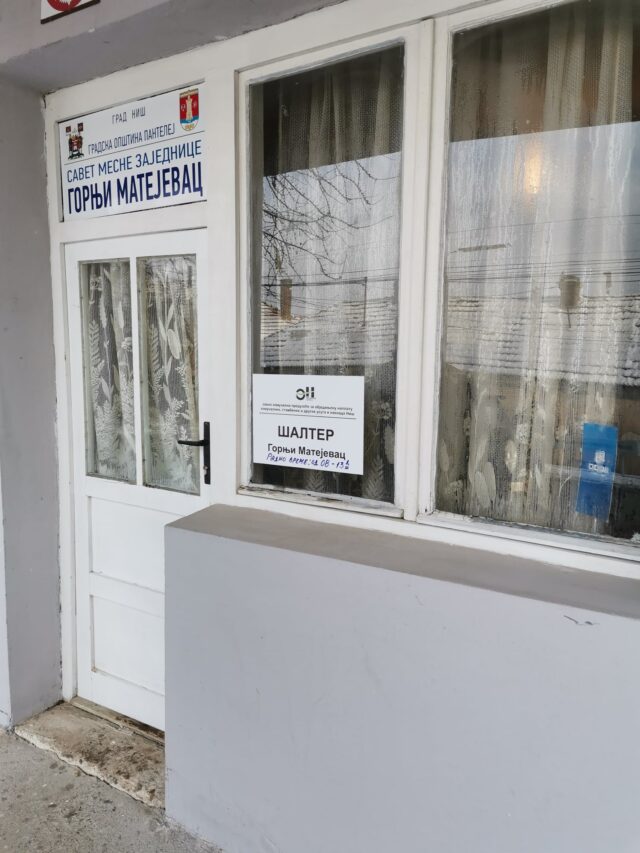 Šalter Objedinjene naplate otvoren je u prizemlju objekta Turističkog doma u Gornjem Matejevcu, u centru sela /u neposrednoj blizini škole/ a zvaničnom početku rada prisustvovali su članovi rukovodstva Gradske opštine Pantelej, Mesnih zajednica Gornji Matejevac i Knez selo i JKP Objedinjena naplata.