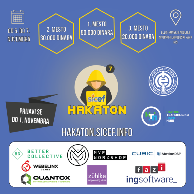 Glavni organizator Hakatona – SICEF (Studentski Inovacioni centar Elektronskog fakulteta u Nišu) je organizacija koja je formirana da bi doprinela studiranju i usavršavanju studenata tehničkih fakulteta i popularizovala struku inženjera. Sa istim ciljem pozivamo sve zainteresovane takmičare da se prijave do 1. novembra i steknu nova prijateljstva, znanja i iskustva!