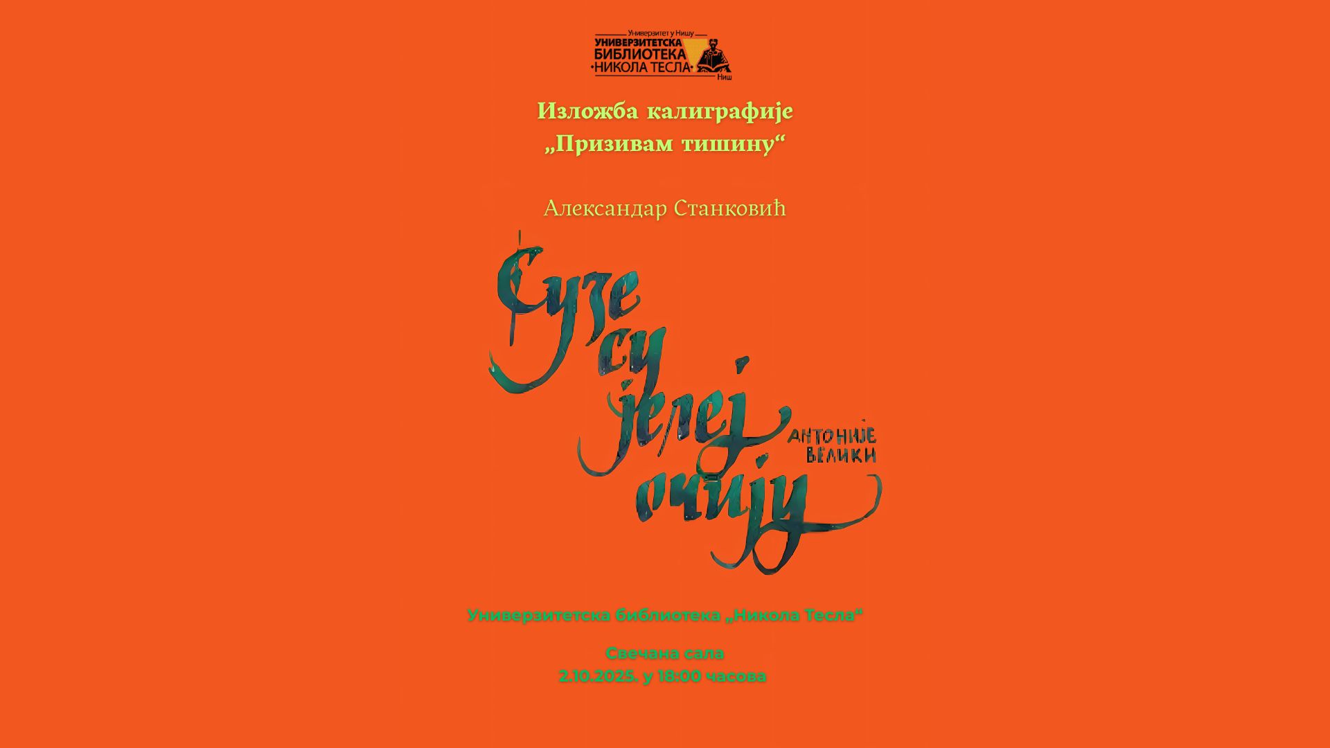 U svečanoj sali Univerzitetske biblioteke „Nikola Tesla” u Nišu, u četvrtak 2. oktobra od 18 časova biće otvorena izložba „Prizivam tišinu” niškog kaligrafa Aleksandra Stankovića.
