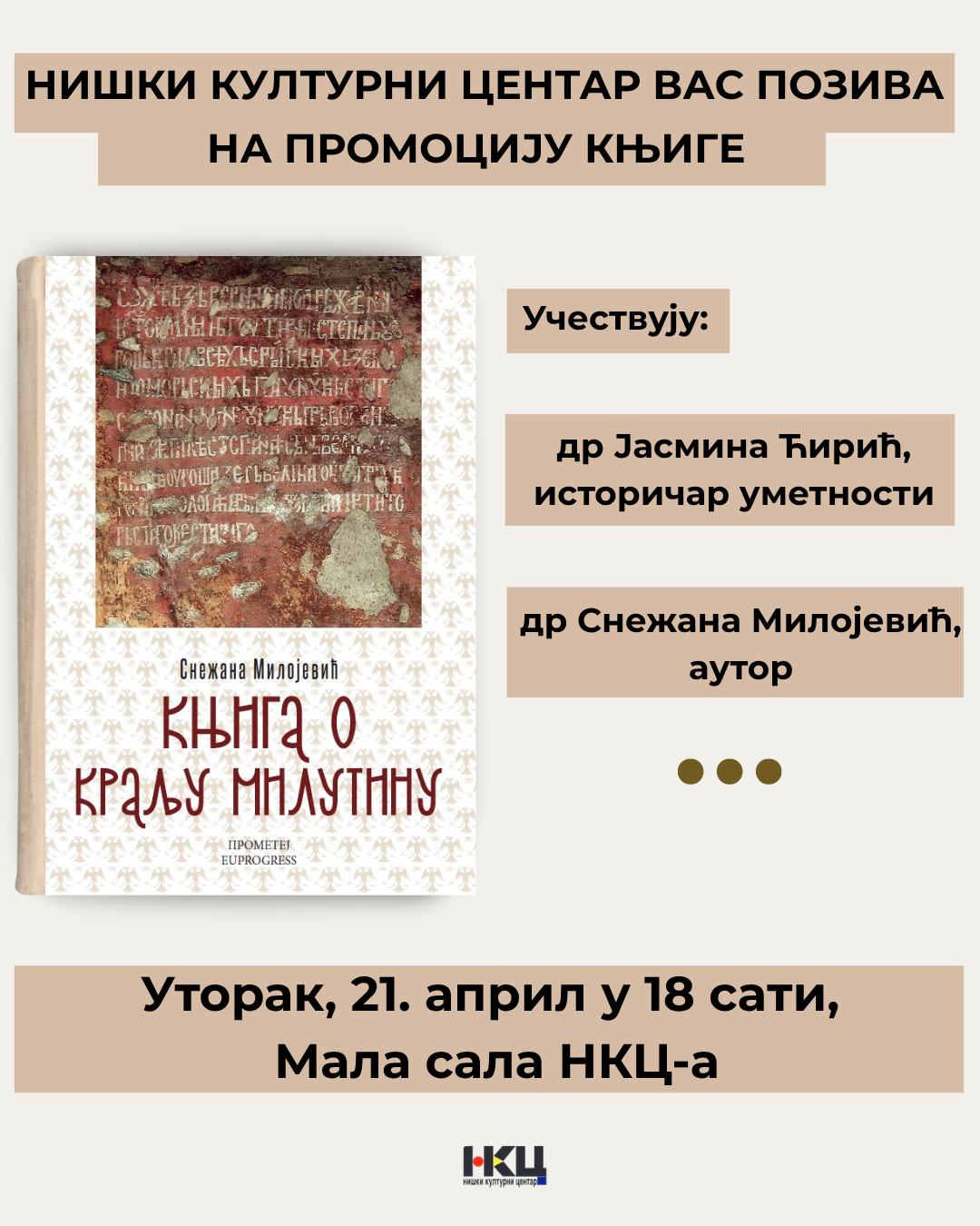 U Maloj sali Niškog kulturnog centra u utorak, 21. aprila, sa početkom u 18 sati, biće održana promocija knjige „Knjiga o kralju Milutinu” autorke dr Snežane Milojević.