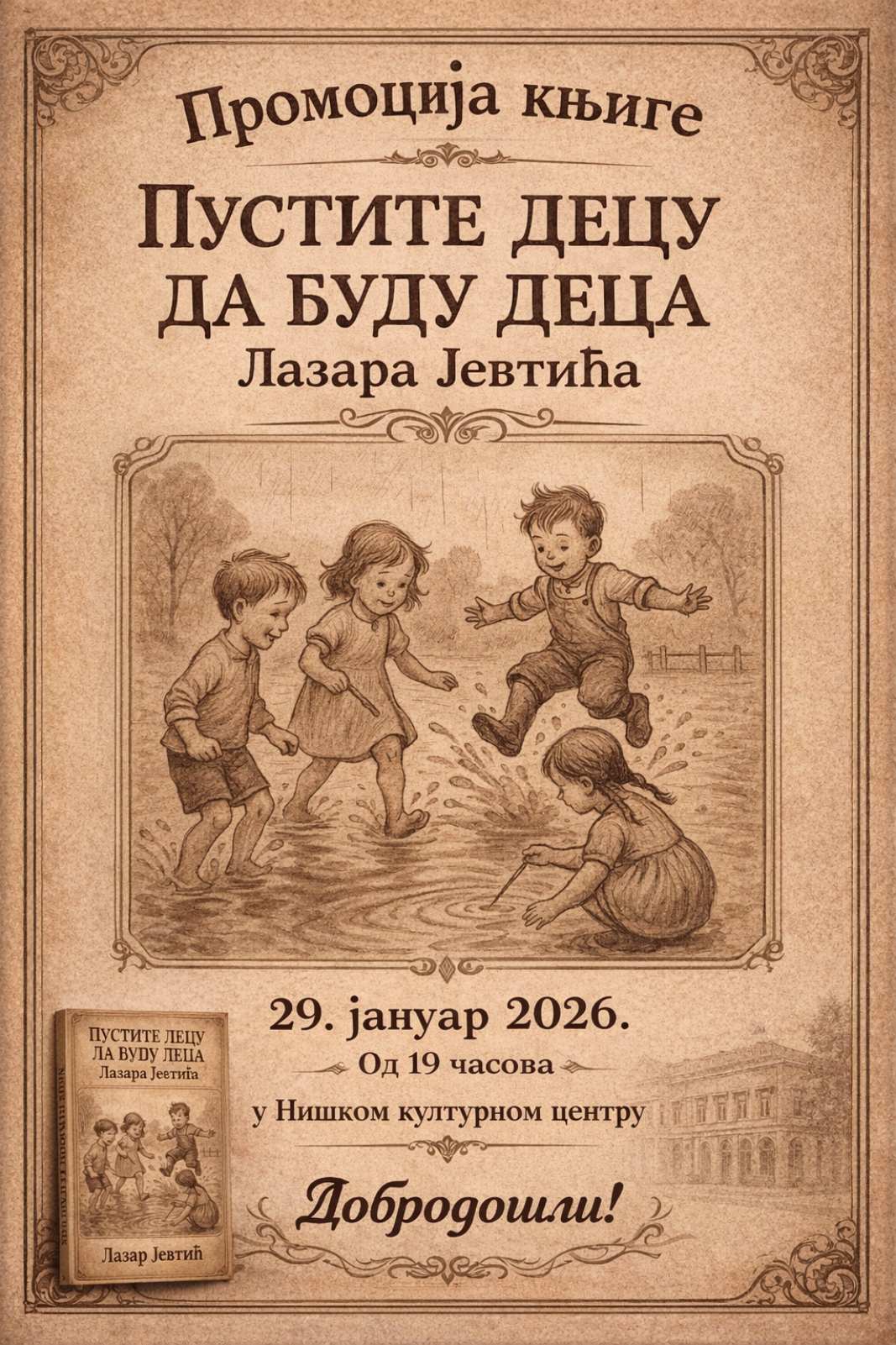 U Maloj sali NKC-a, u četvrtak, 29. januara, sa početkom u 19 sati, biće održano predstavljanje knjige „Pustite decu da budu deca” autora Lazara Jevtića.