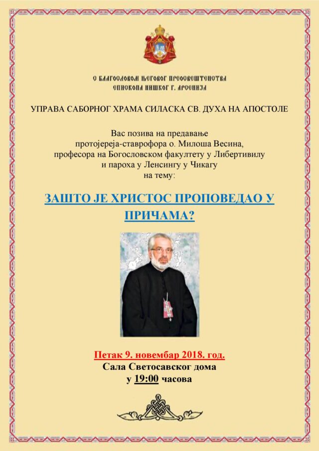 Sa blagoslovom Njegovog Preosveštenstva Episkopa niškog G. G. Arsenija, u sali Svetosavskog doma Sabornog hrama u Nišu, u petak, 9. novembra 2018. godine, od 19 sati, biće održano predavanje visokoprečasnog protojereja-stavrofora dr Miloša M. Vesina na temu “Zašto je Hristos pripovedao u pričama?”.