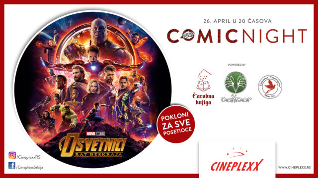 Ljubitelji Marvelovog filmskog univerzuma imaće jedinstvenu priliku da uživaju u dugo iščekivanom filmu „Osvetnici – Rat beskraja“ 3D na specijalnom, prvom Comic night događaju u bioskopu Cineplexx Niš, u četvrtak 26. aprila od 20 časova. Karte za ovaj filmski spektakl uveliko su u prodaji na blagajni bioskopa.