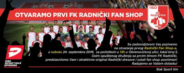 Otvara se prvi Radnički fan shop u centru Niša. Dođite u subotu 24.09.2016 u 13h u Đak sport u Obrenovićevoj (br) i uzmi autogram, slikaj se i druži sa prvim timom FK Radnički Niš. Za sve prave Meraklije obezbedili smo super atraktivne originalne Radnički dresove i ostali fan shop asortiman sa 20% popusta kao i na novu Hummel kolekciju. Dođi u Đak, podrži Radnički dokaži da si pravi Nišlija!