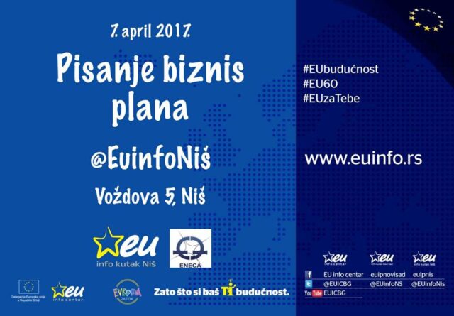 U okviru Kampanje za mlade, EU info kutak i ENECA organizuju radionicu za pisanje biznis plana 7. aprila od 11 sati u prostorijama EU info kutka. Pozivamo mlade koji su spremni da zakorače u svet biznisa da prođu osnove razvoja biznis plana i upoznaju se sa izazovima koje preduzetnike čekaju, potrebama koje se javljaju i veštinama koje su im neophodne za uspešno poslovanje.