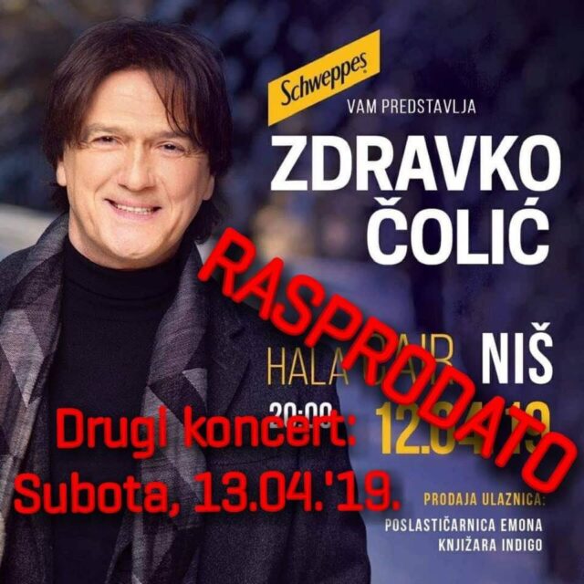 Karte za koncert Zdravka Čolića koji je zakazan za 12. april u niškoj hali „Čair“ su rasprodate, pa pevač odlučio da Nišlijama održi još jedan koncert već naredne večeri, 13.aprila sa početkom u 20 sati in a istom mestu, u hali Čair.