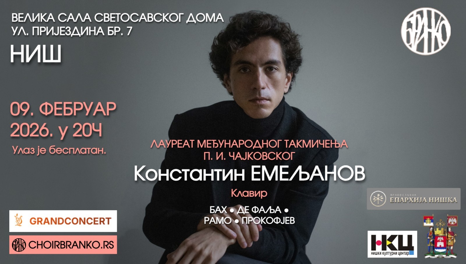Niški kulturni centar organizuje klavirski resital mladog ruskog pijaniste Konstantina Emeljanova, koji će biti održan u ponedeljak, 9. februara, u Velikoj sali Svetosavskog doma, sa početkom u 20 sati.