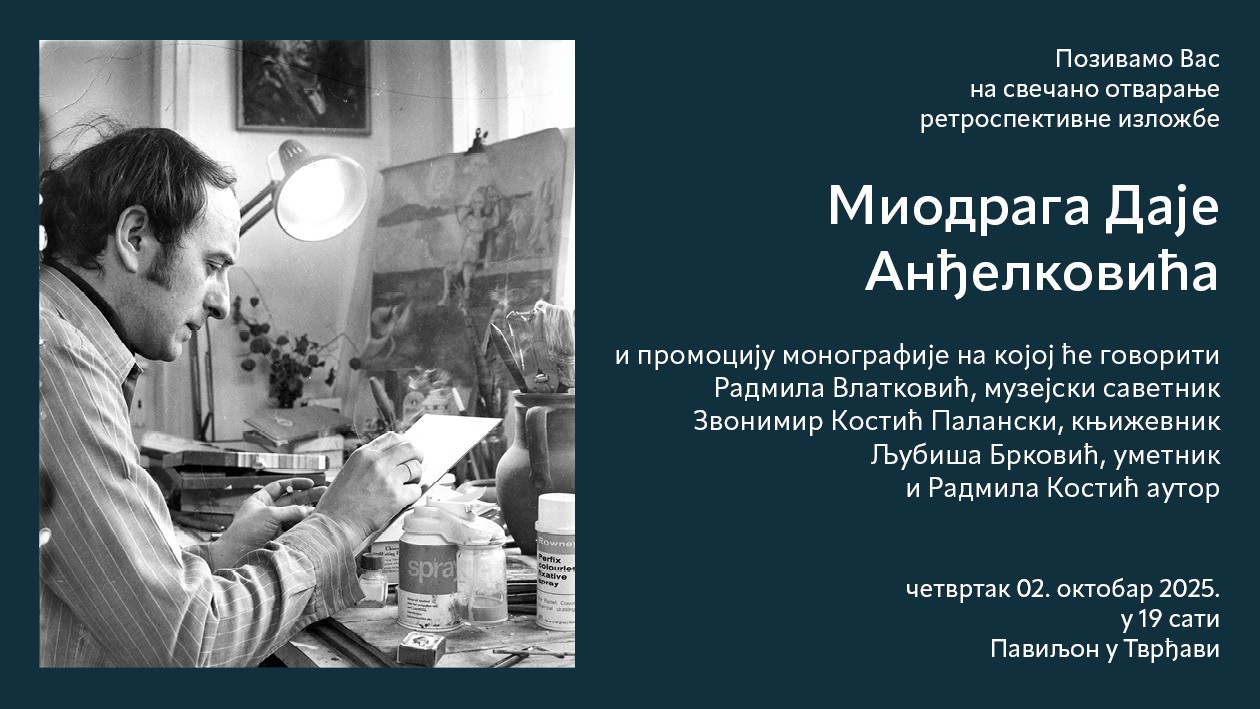 U Paviljonu u Tvrđavi u četvrtak, 2. oktobra, u 19 časova biće otvorena retrospektivna izložba i održana promocija monografije posvećene umetniku Miodragu Daji Anđelkoviću. O njegovom životu i stvaralaštvu govoriće Radmila Vlatković, muzejski savetnik, književnik Zvonimir Kostić Palanski, umetnik Ljubiša Brković i autorka monografije Radmila Kostić.