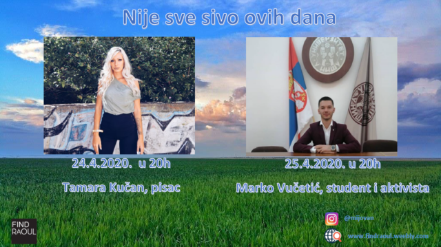 Razgovori „Nije sve sivo ovih dana“ održaće se u petak 24.4.2020. i u subotu 25.4.2020. u 20h na instagram nalogu @mijovan i @findraoul , razgovori će biti dostupni i na portalu organizacije „Nađi Raula“ (www.findraoul.weebly.com). Posetioci ovih razgovora mogu postavljati pitanja u svakom trenutku. Sve razgovore ove nedelje vodi Jovan Milić i svi razgovori ove nedelje su na srpskom jeziku, dok će razgovori naredne nedelje biti na engleskom jeziku.