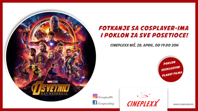 Ljubitelji Marvelovog filmskog univerzuma imaće priliku da uživaju u filmu „Osvetnici – Rat beskraja” u bioskopu Cineplexx Niš, u STOP SHOP ritejl parku, uz pokone i nesvakidašnje domaćine! U subotu, 28. aprila od 19 do 20 časova, svi ljubitelji superheroja, uz kupljenu ulaznicu za film „Osvetnici – Rat beskraja” dobiće na poklon ekskluzivni plakat filma!