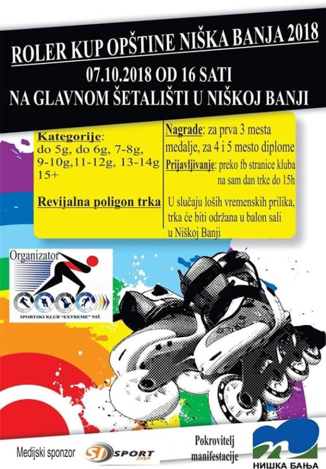 U nedelju 07.10.2018 od 16h u Niškoj Banji na glavnom šetalištu trka otvorenog tipa za svu decu grada Niša bez obzira da li treniraju rolere ili ne. Prijava preko fb stranice Sportski klub Extreme, ili na tel 0641275000, takođe se možete prijaviti na sam dan trke do 15:30.