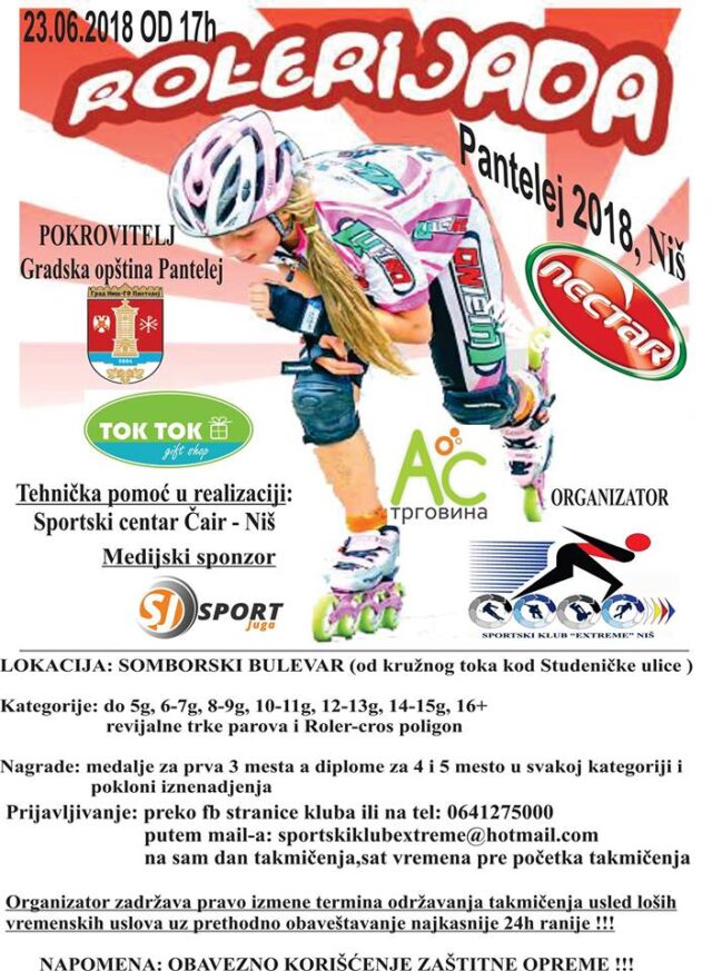 Gradska opština Pantelej u saradnji sa Sportskim klubom „Extreme“, već drugu godinu zaredom, organizuje Rolerijadu u brzinskom nadmetanju u subotu, 23.juna 2018. od 17,00 na trasi Somborskog bulevara kod kružnog toka na raskrsnici sa Studeničkom ulicom.