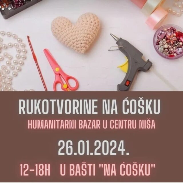 Udruženje za negovanje tradicije „Višnja“, uz podršku Gradske Opštine Medijana, sa zadovoljstvom najavljujem humanitarni bazar ručnih radova, koji će se održati u kafiću „Na Ćošku“ u Kazandžijskom sokačetu , u petak 26. januara 2024. godine. Prikupljena sredstva namenjena su podršci „Udruženju Dan“, čije aktivnosti imaju za cilj pružanje pomoći onima kojima je najpotrebnija.