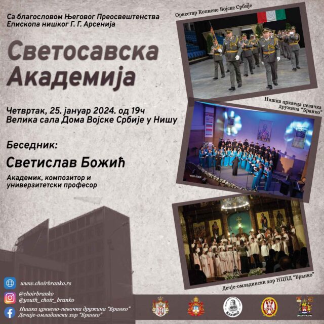 Sa blagoslovom Njegovog Preosveštenstva Episkopa niškog g. Arsenija u organizaciji Crkvene opštine Niš i NCPD „Branko“, Svetosavska akademija biće održana večeras u Domu Vojske sa početkom od 19 sati.