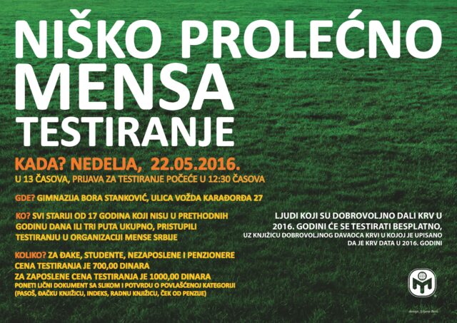 Mensa Srbije organizuje prolećno testiranje inteligencije u nedelju, 22.05.2016. godine, u prostorijama gimnazije “Bora Stanković”, ulica Vožda Karađorđa 27 sa početkom od 13h.