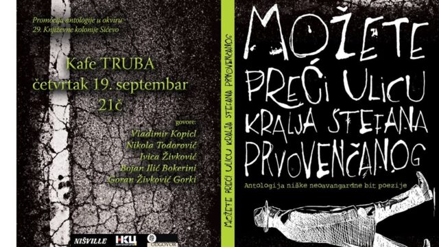 U caffe-u Trubi vreme od 21 čas je rezervisano za promociju antologije neoavangardne niške bit poezije „Možete preći ulicu kralja Stefana Prvovenčanog“ u izdavaštvu NKC i DKN. Na promociji učestvuju: Goran Živković, Nikola Todorović, Ivica Živković, Bojan Ilić Bokerini, Vladimir Kopicl i Dalibor Popović Pop.