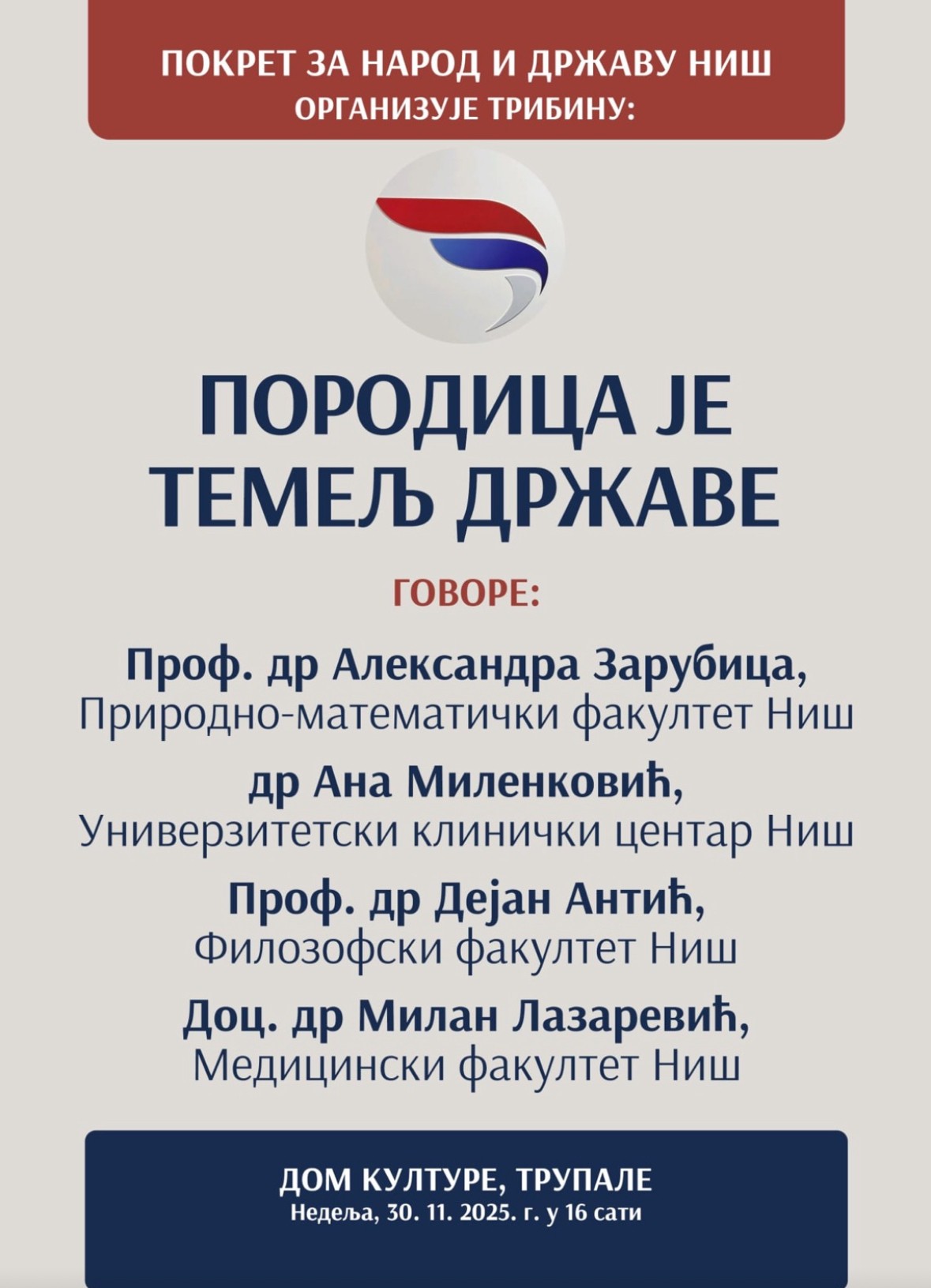 U nedelju, 30. novembra od 16 časova, u Domu kulture Trupale biće održana tribina pod nazivom „Porodica je temelj države”, u organizaciji političke organizacije Pokret za narod i državu Niš.