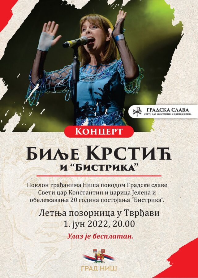 Povodom proslave gradske slave Sv. cara Konstantina i carice Jelene, koja se održava na više lokacija u gradu i u svim gradskim opštinama od 31. maja do 05. juna 2022. godine, Turistička organizacija Niš organizuje koncert Biljane Krstić i „Bistrika“.
