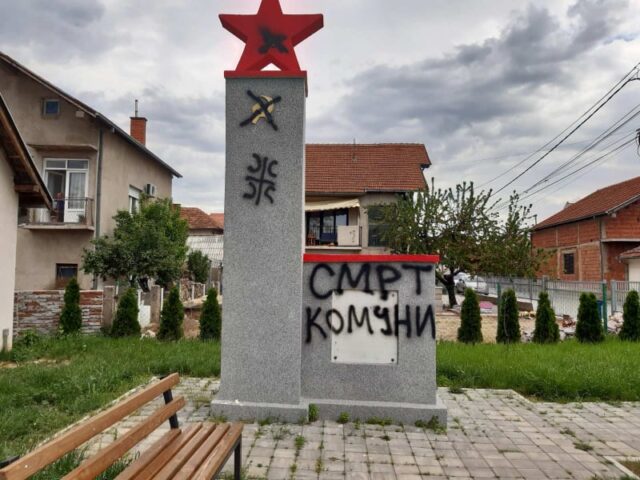 Na spomeniku je crnim sprejom napisano „smrt komuni“, precrtani su petokraka, srp i čekić, a docrtana su četiri ocila.