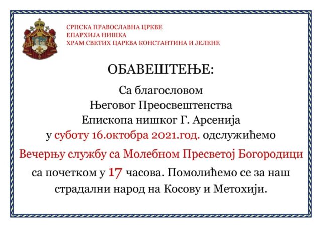 U subotu (16.oktobar) MOLEBAN za podršku braći sa Kosmeta, sa blagoslovom Njegovog Preosveštenstva Episkopa niškog G.G. Arsenija.