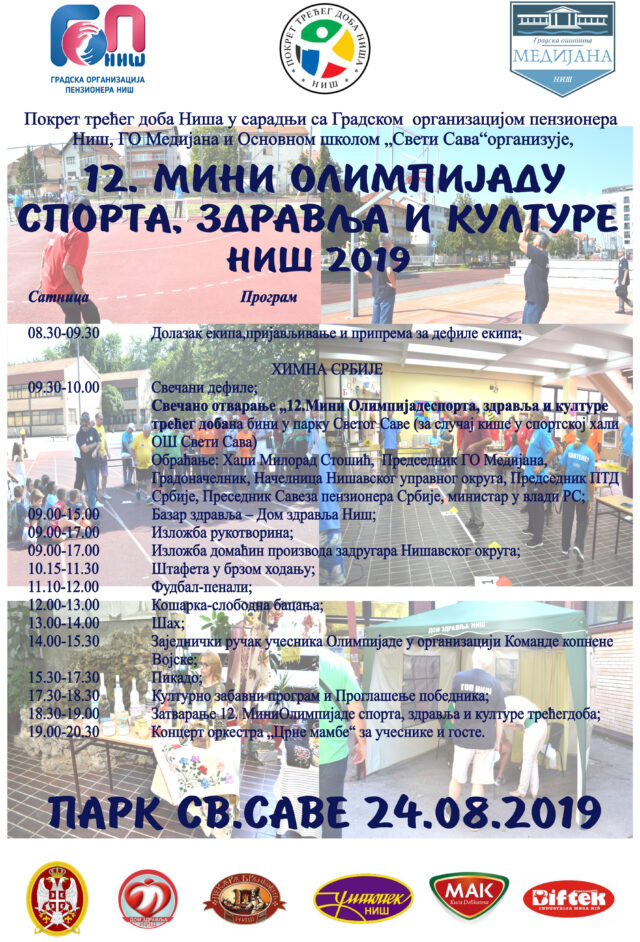 Pokret „Trećeg doba“, Gradska opština Medijana, Gradska organizacija penzionera Niš i Osnovna škola „Sveti Sava“ narednog vikenda organizuju„ „12. mini olimpijadu sporta, zdravlja i kulture trećeg doba Niš 2019”.