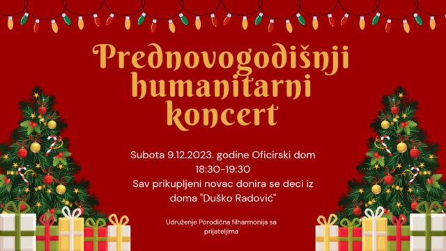 U subotu 9. decembra 2023. godine biće održan humanitarni koncert koji organizuje udruženje „Porodična filharmonija“, sa prijateljima, u sali Oficirskog doma. Ulaznica je novčani prilog za decu iz Doma za decu i omladinu „Duško Radović“.