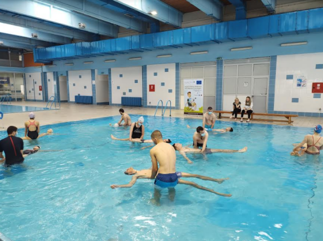 Nakon uspešno završenih aktivnosti 3. i 4. koje su podrazumevale pripremu odgovarajućih trenažnih materijala i metodologija za primenu plivanja, funkcionalnog treninga i kardio fitnesa kod osoba sa invaliditetom, na fakultetu je uspešno startovala realizacija aktivnosti broj 5. koja podrazumeva teorijsku nastavu i praktične vežbe iz primene plivanja za osobe sa invaliditetom.