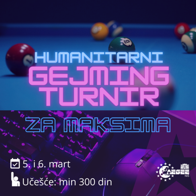 U cilju prikupljanja novčanih sredstava za lečenje Maksima Milenkovića iz Niša kome je dijagnostikovano da boluje od cerebralne paralize, astme, epilepsije i deficiteta biotinidinaze, omladinska organizacija „AEGEE-Niš“ organizuje Humanitarni gejming turnir koji će se održati 05. 03. putem ,,Twitch” naloga AEGEE-Niša od 13č, ali i uživo u bilijar klubu „ATLANTIS“, dana 06. 03. sa početkom od 12č.