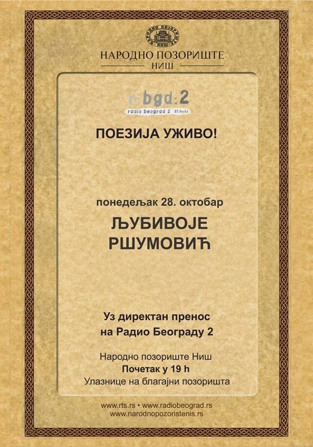 Srpski pesnik, najviše prepoznatljiv po poeziji za decu, Ljubivoje Ršumović družiće se sa ljubiteljima poezije u Narodnom pozorištu 28. oktobra od 19 sati. Karte za veče Ljubivoja Ršumovića pod nazivom „Poezija uživo“ mogu se kupiti na blagajni Narodnog pozorišta Niš po ceni od 200 dinara.