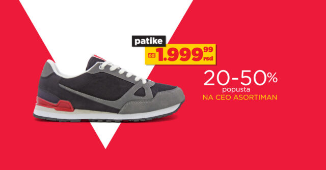 Velika akcija u u ĐAK SPORTU patike od 1.999,99 rsd! Dodatno, iskoristi od 20-50% popusta na SVE PATIKE, TRENERKE, MAJICE i ostalu sportsku opremu najpoznatijih svetskih brendova: Nike, Adidas, Hummel, Kappa, Reebok.