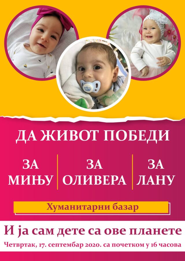 Prvi humanitarni bazar, u organizaciji grupe, biće održan u četvrtak 17.9.2020. kod Kalče sa početkom u 16h i trajaće do 21h. Sav prihod bazara namenjen je ovog puta Lani, Minji i Oliveru, bebama obolelim od SMA-spinalne mišićne atrofije tipa 1, za čije lečenje u SAD-u je potrebno 2.4 miliona dolara svakom od njih.