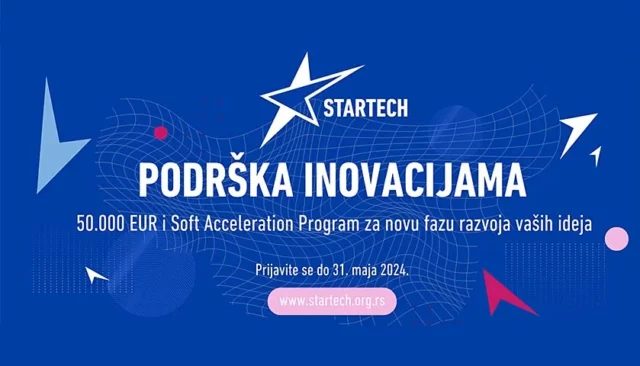 Inovatori u Srbiji po četvrti put imaju priliku da se prijave na StarTech program i dobiju do 50.000 dolara bespovratne pomoći. Osim toga, ove godine uveden je i konkurs za Program ubrzanog razvoja koji obuhvata obuke i mentorstvo, kao i podršku u izradi i plasiranju materijala koji naše inovatore treba da predstave u najboljem svetlu potencijalnim investitorima, a njihove proizvode stranim tržištima. Ovo uključuje i mogućnost učešća na događajima za povezivanje startapa i investitora i na međunarodnim sajmovima i izložbama.