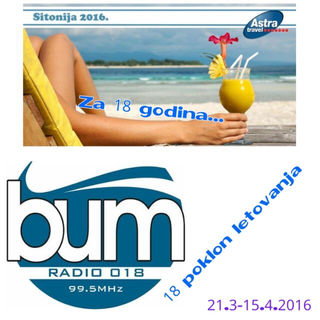 Na talasima radija Bum 018 – 99,5 MHz počela je nova BUMbastična poklon igra, u kojoj vas nagrađuje turistička agencija ASTRA TRAVEL. Od 21.marta do 15. aprila imate šansu da osvojite jedno od 18 poklon putovanja za 3 osobe na Sitoniji (Halkidiki).