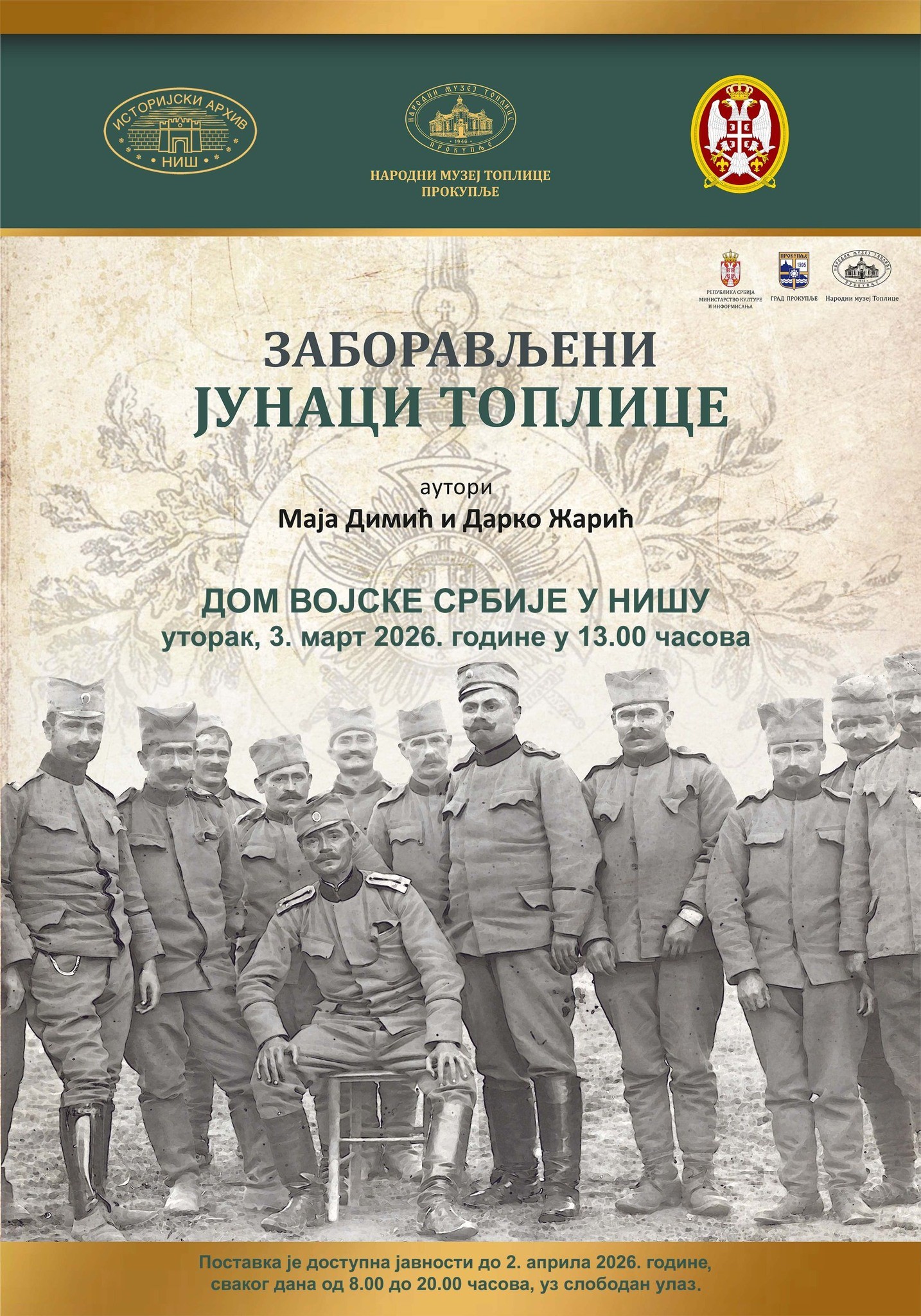 U Domu Vojske u Nišu biće otvorena izložba „Zaboravljeni junaci Toplice”, u organizaciji Narodnog muzeja Toplice, koja donosi svedočenja o ratnicima ovog kraja u Prvom svetskom ratu. Svečano otvaranje zakazano je za 3. mart u 13 časova.