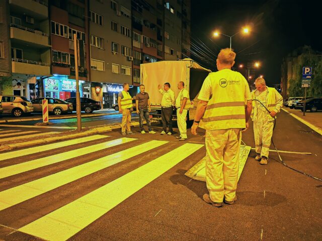 Horizontalna signalizacija u ulici 7. jula, od raskrsnice sa ulicom Kralja Stefana Prvovenčanog do početka Bulevara Nemanjića, sinoć je kompletno obeležena i saobraćajnica je puštena u rad. Direktor preduzeća Dejan Dimitrijević obišao je ekipe na terenu.