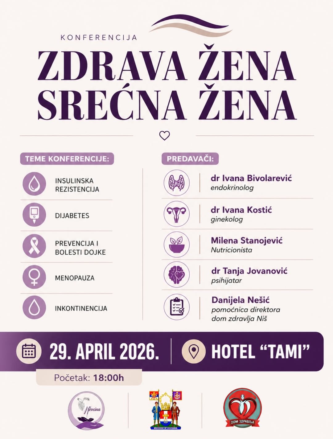U organizaciji Udruženja „Heroine”, večeras će u hotelu „Tami” u Nišu biti održana konferencija pod nazivom „Zdrava žena, srećna žena”. Događaj počinje u 18 časova, a ulaz je slobodan.