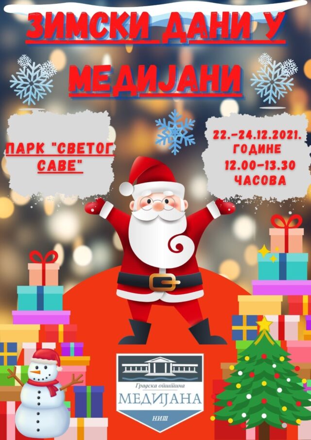 Peta po redu manifestacija „Zimski dani u Medijani 2021“ u organizaciji Gradske opštine Medijana, održaće se 22, 23. i 24. decembra 2021. godine, u vremenu od 12 do 13.30 sati, u Svetosavskom parku u Nišu.